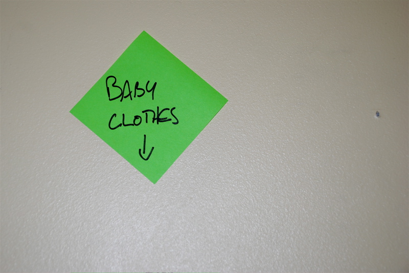 Post-its labeled everything: things to pack (green) and things to leave for storage (pink):