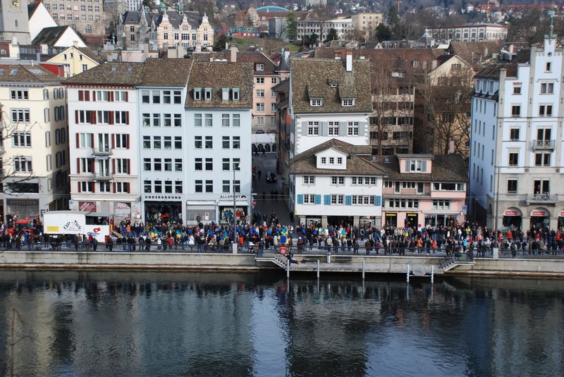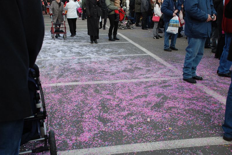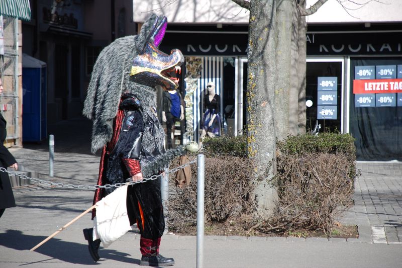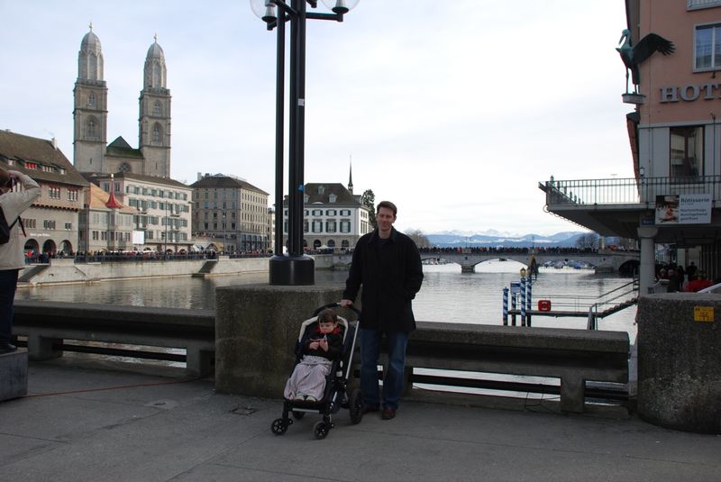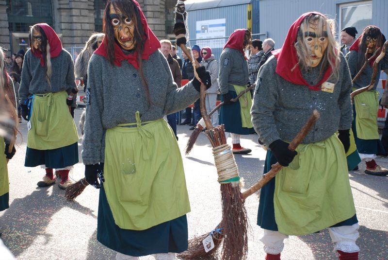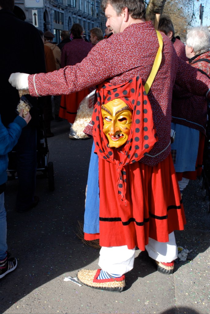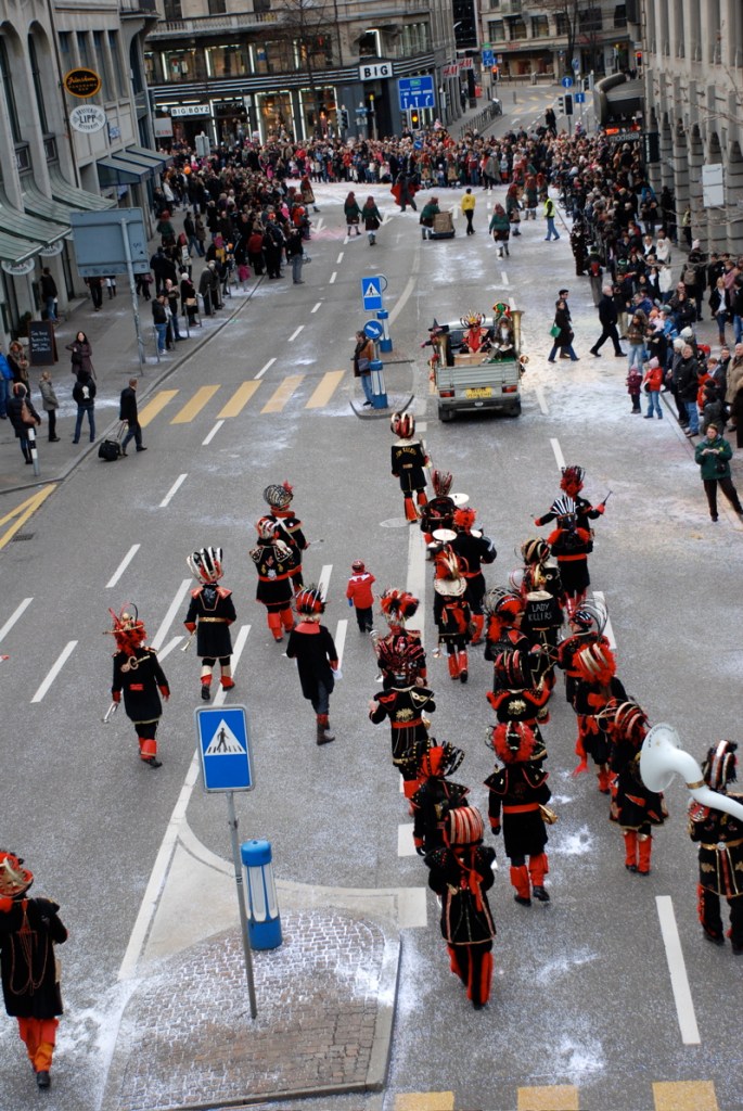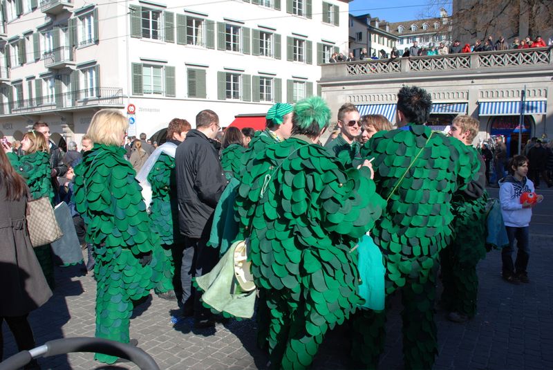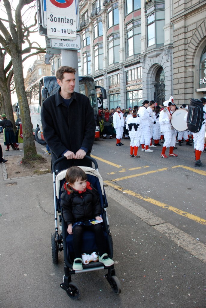 So the middle of our day was spent in Zurich and Fasnacht was happening. Fasnacht is like Mardi Gras – you know – people celebrating, acting goofy and filling there bellies before lent. Apparently Zurich’s Fasnacht is pretty tame compared to other cities. But it was plenty of fun for us – we saw lots of bands and interesting costumes and the crowd didn’t seem too stifling. Bea was in a grump of a mood most of the time – I suspect she was still tired from our shopping marathon at IKEA yesterday. I think she enjoyed most of the day from the comfort of her stroller. Except when some of the scary witch parade people got in her face and offered her candy. She got scared and said she wanted to go home. I can’t blame her those masks are frightening. I preferred the band that was dressed as swans. She cheered up when we sat down to have a warm drink and she ate her candy. Then she finally fell asleep in her stroller on our way home and she didn’t even wake up when I took her out of her stroller and put her in our bed. It was a beautiful day, I’m so glad we went down to see the festivities and to get to know Zurich a bit better.
