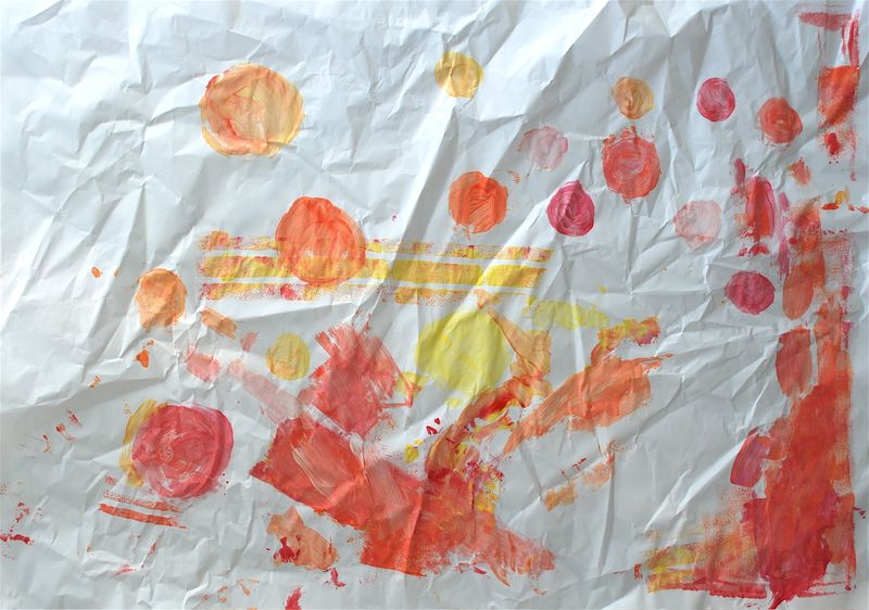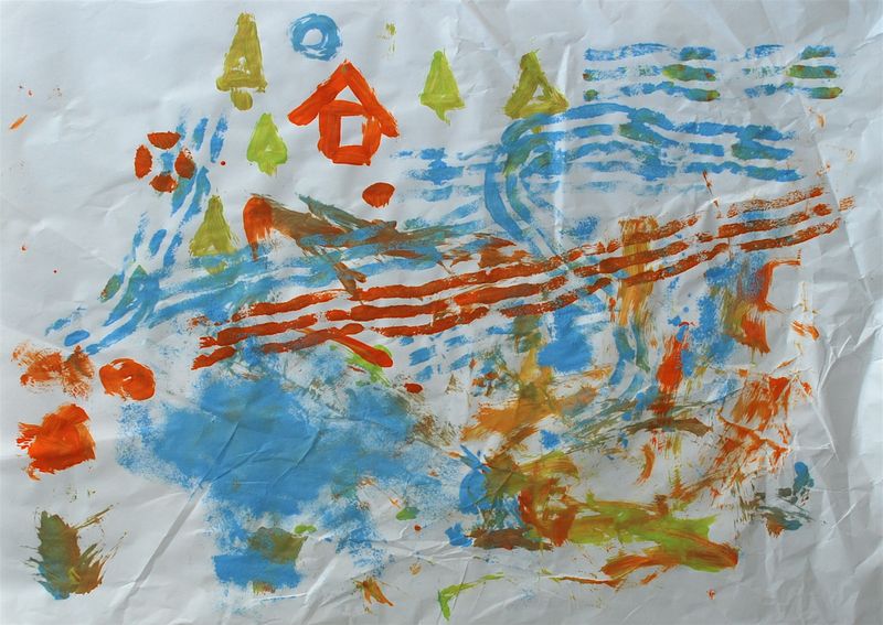 We have loads of big papers left from the packaging of our stuff. It’s a little wrinkled but we don’t mind. It’s perfect for using the new paints that Bea got from Grandpa and Grandma C. for her birthday. Here are a couple of our masterpieces: