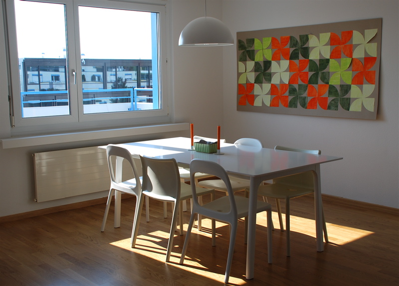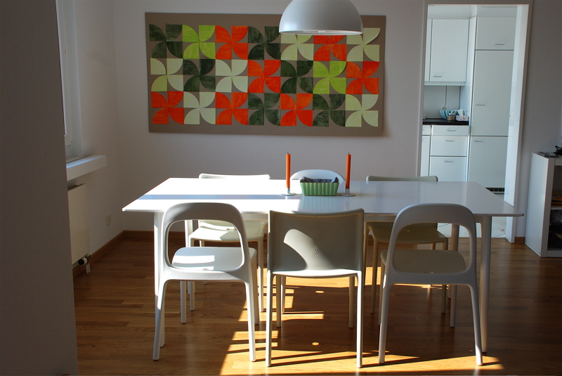 I finished my little craft project and our dining room is looking more pulled together. Our home is a huge canvas of white – white walls, white cabinets some white floors and lots of white furniture. Hopefully this will liven up our dining area a little – I got the idea from the picture at the bottom. It’s just made out of quarter circles of painted paper glued onto a big piece of cardboard. Brian installed the light over the table this weekend so all our evening meals don’t have to be romantic candle-lit affairs. I didn’t photograph the other side of the room because there is still a gigantic mountain of cardboard there. I think cardboard recycling day doesn’t happen for another couple weeks.