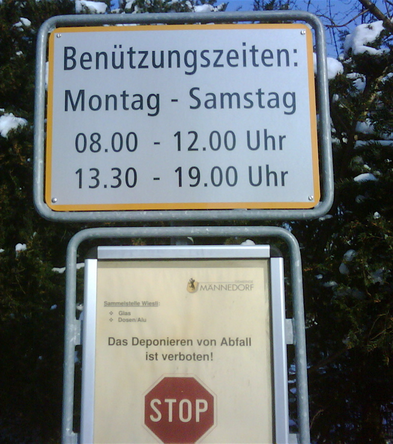 Also, they are very strict about how and when things are recycled. This sign is posted at a glass and metal recycling spot – basically just a series of big bins along a quiet neighborhood road. There is a bin each for aluminum cans and brown, green and clear glass. As you can probably see, the sign says you cannot recycle on Sunday and you cannot recycle around lunch time.
