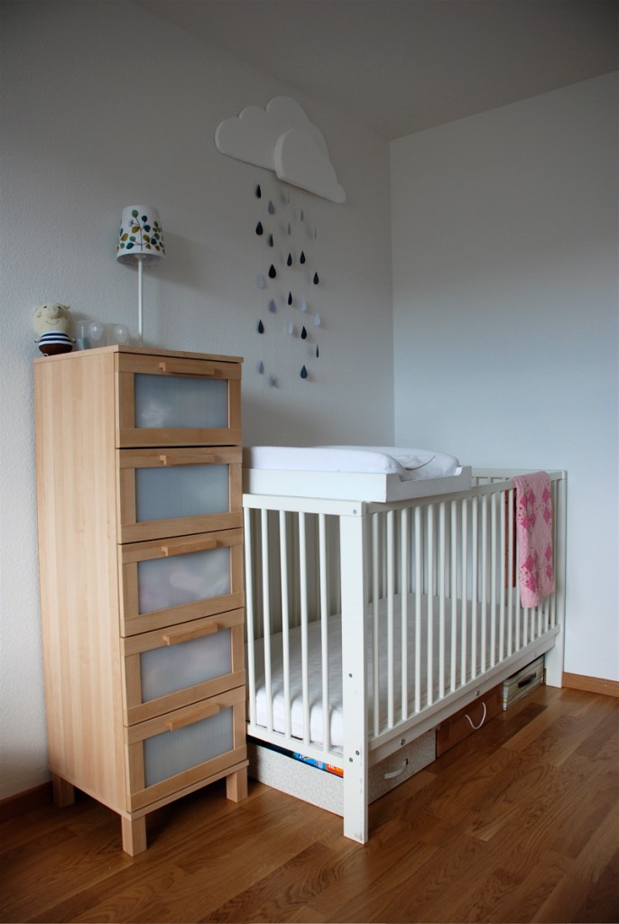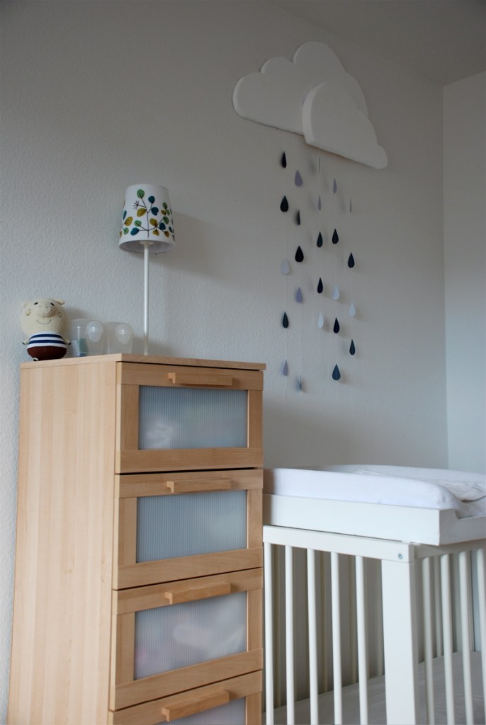 I made the cloud with raindrops this morning. It’s made from leftover pieces of styrofoam – more packaging from our IKEA stuff. I cut out paper raindrops and sewed them together on the sewing machine. Cutting styrofoam like this is very very messy. It looked like it had snowed when I was done. The finished cloud is of course very light so I didn’t have to make any holes in the wall to hang it. We are wary of putting tons of holes in the walls because we will just have to fill and paint in 3 short years when we move out.