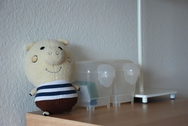 Still needs a little work. I basically only took care of the fun stuff. I might put up those black and white pictures that were above Bea’s bed. And I’m expecting a new little quilt from Grandma C. (am I right?). The piggy was a little indulgence from Three Potato Four.