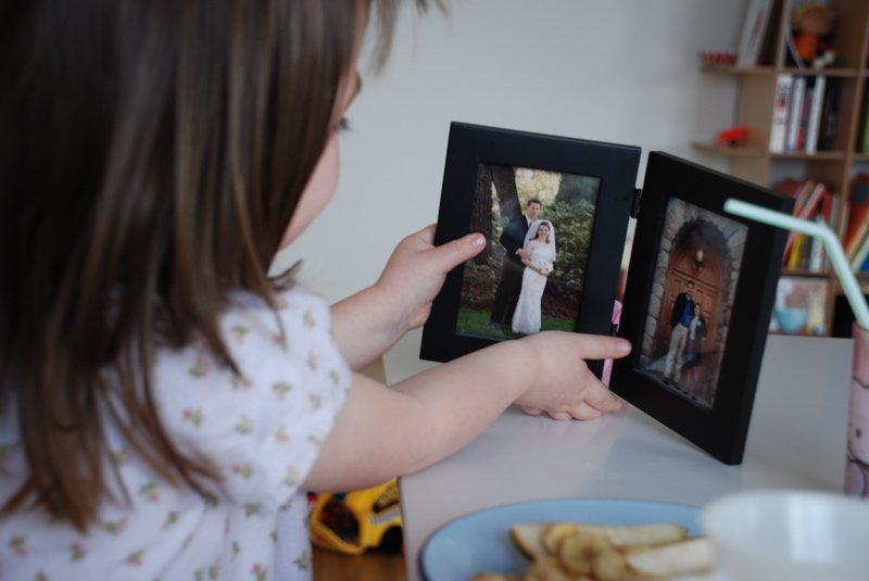 While we were having a snack I told Bea that today is the day that Mommy and Daddy got married eight years ago. I said it was a good day. She ran and got the wedding pictures that sit next to our bed. Then she told me she wished she could marry me.