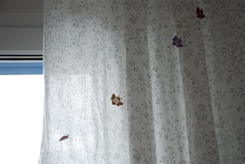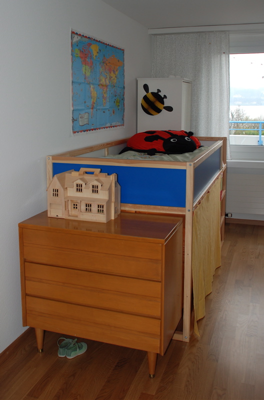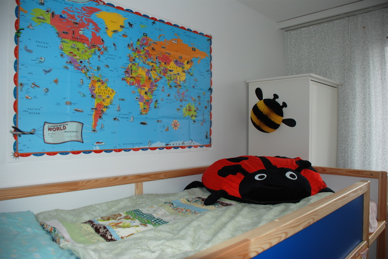It really makes me feel like a Mom, and a grown-up for that matter, to have a whole room dedicated to children. We had an office slash kid room before, but now we have a full fledged kid’s room. We cleaned up and put some stuff on the walls today. We’re developing a bit of a bug theme on Bea’s side of the room. We hung up our world map – good for pointing out where grandmas and grandpas live and where we live now. We have a big ladybug pillow from IKEA. And we put up our paper bumble bee that we found at The Paper Place in Midland. I love how her doll house looks on the church rummage sale dresser. We’ll renovate that house someday. We made a paper bumble bee garland to hang in front of the curtains. I finally finished the curtain for the bottom part of Bea’s bed – it makes it a private little space just for her. We read books down there before bedtime – we even installed a light. I’m really enjoying making the room a bright and comforting spot and I love seeing Bea happy in her big girl bed. Lately after we tuck her in she insists on “reading” for a while. She takes the three books that we read and re-reads them to herself. I stand outside her door listening to her sweet animated rendition of each story. I also like the idea that she may be developing a love of books. I can almost picture my teenage Bea reading in her bed late into the night and having to nag her to turn her light out. A mom can hope… right?