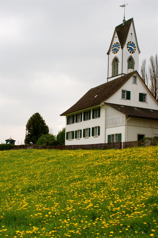 Here are a couple photos from our walk through Uetikon. The churches in towns our size all seem the same. It’s like they ordered them from a kit – they all have that same blue clock face. This one looked so pretty surrounded by dandelions.