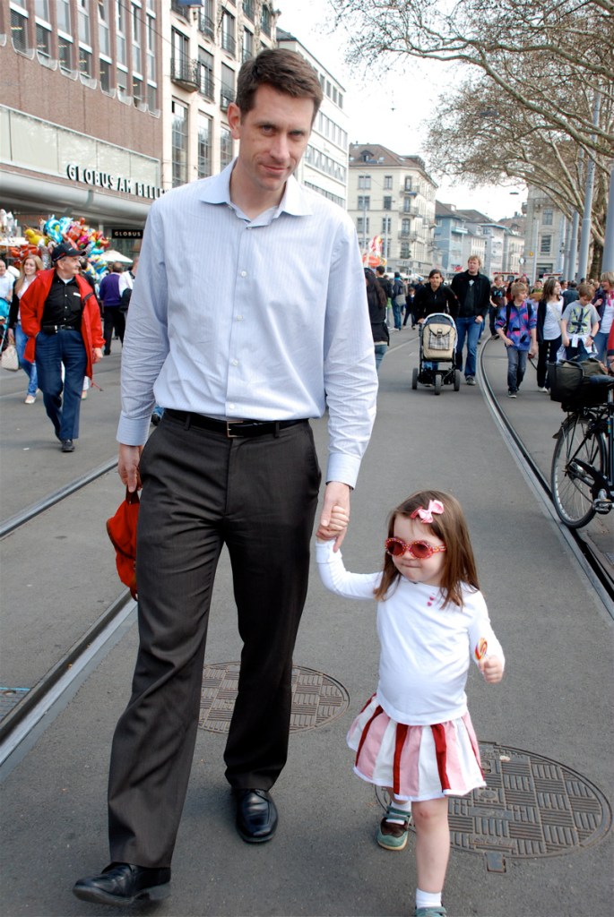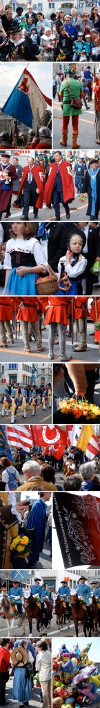 We had to head home before the actual burning of the snowman but we caught what we could of the parade. It was a beautiful spring day and even though we waded through a huge crowd of people the atmosphere seemed really mellow. Everyone was just smiling and having a good time. All the Swiss people had big bouquets of flowers tucked under their arms or in big baskets. There were horses and bands and colorful flags and camels and people of all ages dressed up in traditional costumes. The streets were closed and filled with carnival type stands selling sausages, ice cream, pretzels and candy and toys and balloons for kids.