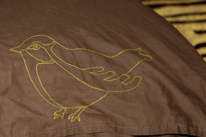 Here’s a photo of one of the pillowcases that Jennifer embroidered for me. Aren’t they charming and they go with my quilt.