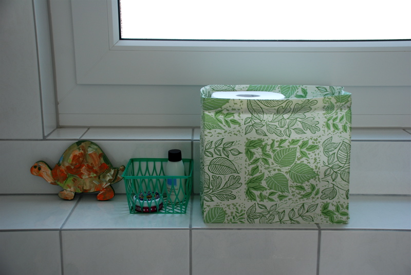 One more little project I finished last night. It’s a silly little project and I think Brian was laughing at my enthusiasm. It’s a little box to hold toilet paper in the guest bathroom. We just have a pedestal sink in there with no storage at all. You’ve got to have a place to stash stuff like towels and toilet paper so I put the towels in a basket on the floor and this little box sits on the ledge above the toilet. It’s made out of some plastic table cloth fabric.