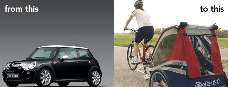 – We’ve traded one mode of transport for another. I’m still sad about having to sell my MINI but hopefully we can get lots of milage out of our new vehicle. I was treking across town the other day to get a used bike trailer – big enough for two kids and some groceries. And yes it seems that the new vehicle has about the same capacity as the last vehicle.