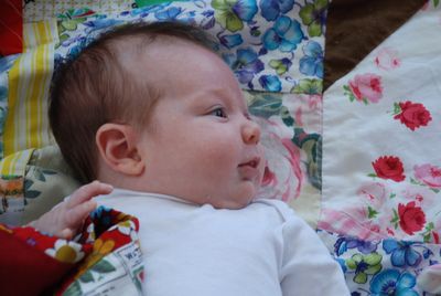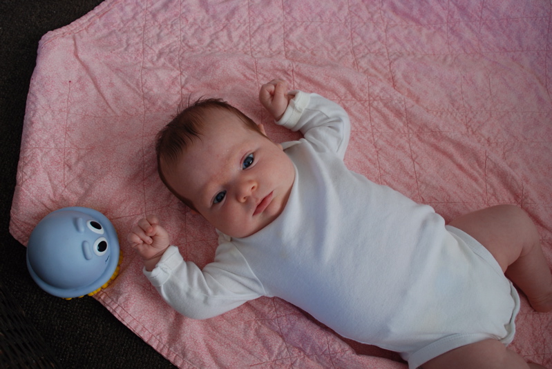 For about a week I kept telling Brian that I swore Claire was smiling during the day. She’d flash me some grins and wide mouth smiles just one or two fleeting moments each day. But I wasn’t sure – I thought maybe they were still just practice smiles. Then tonight at dinner I was holding Claire while talking to Brian and I looked down to see that she was trying to get my attention with some unmistakable smiles. Brian even got to see them from across the table. And she even did some quick giggling with her mouth wide open and her eyes squinting. Oh my – I’ve been waiting for this and now I’m hungry for more.