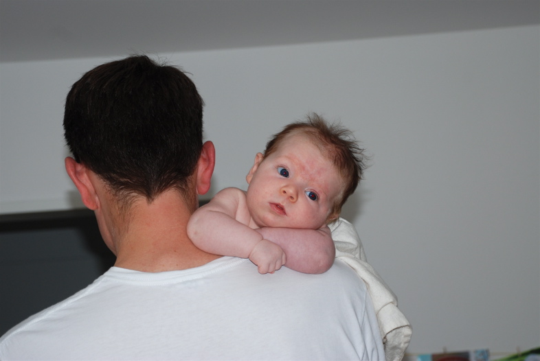 And here’s Claire fresh from her bath with some crazy hair. She’s saying hey I’m the babymeister and I’m just chillin’ here on Daddy’s shoulder.