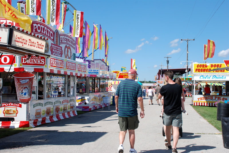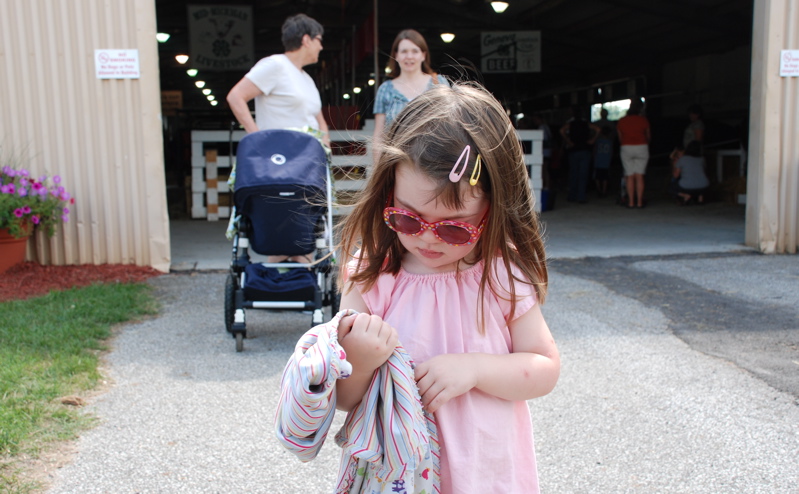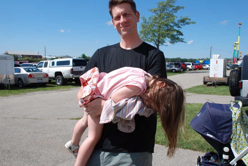 And then it was time for another bit of Americana. The fair. We saw all the animals – including the Swiss style cows. And we walked down the colorful midway – elephant ears anyone? During our whole trip Bea was over tired. She fell asleep mid-bite on the airplane, fell asleep right before dinner several times and in these photos, she fell asleep in Brian’s arms at the fair.