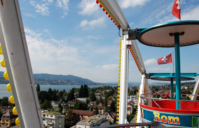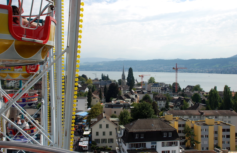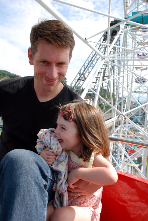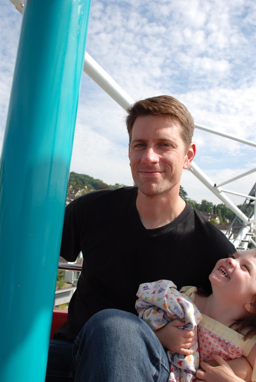 We went to our first Chilbi (pronounce the Ch like you have a bug stuck in your throat). A Chilbi is a traveling fair type of thing with kiddie rides and fair food. Great fair food like sausages and plates full of melted cheese and fresh filled doughnuts. Bea, despite lots of coaxing from Brian, was only interested in riding the Ferris Wheel. And Brian was so keen on making sure Bea had a good time that he, again, swallowed his fear of heights and rode on the ferris wheel with us. It was great fun, but that smile you see on Brian’s face has a wee bit of tension in it.