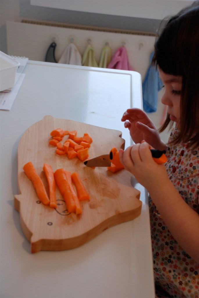 Here’s Bea cutting some carrots that she then did not eat. But the cool thing here is her little practice knife that Grandma J. gave her for Christmas. It looks like a doggy complete with a wiggly tail. And check out the piggy cutting board that Brian gave me. His name is Horace.
