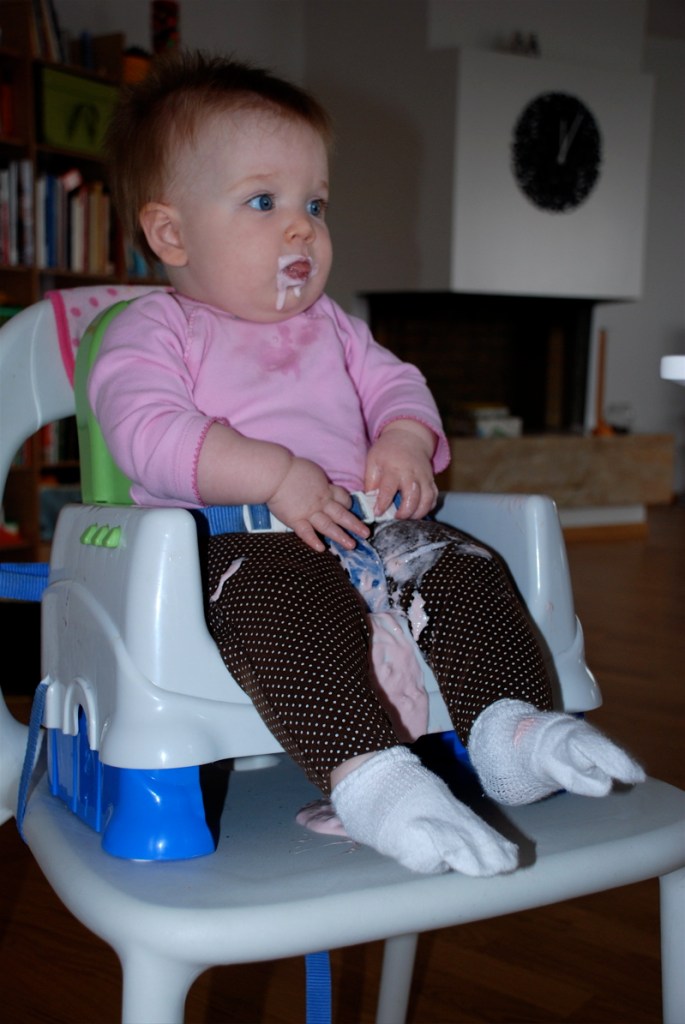 – She is slowly – ever so slowly – getting the hang of eating. I set a container of yogurt within her reach the other day and she dumped it in her lap. She likes strawberry yogurt.