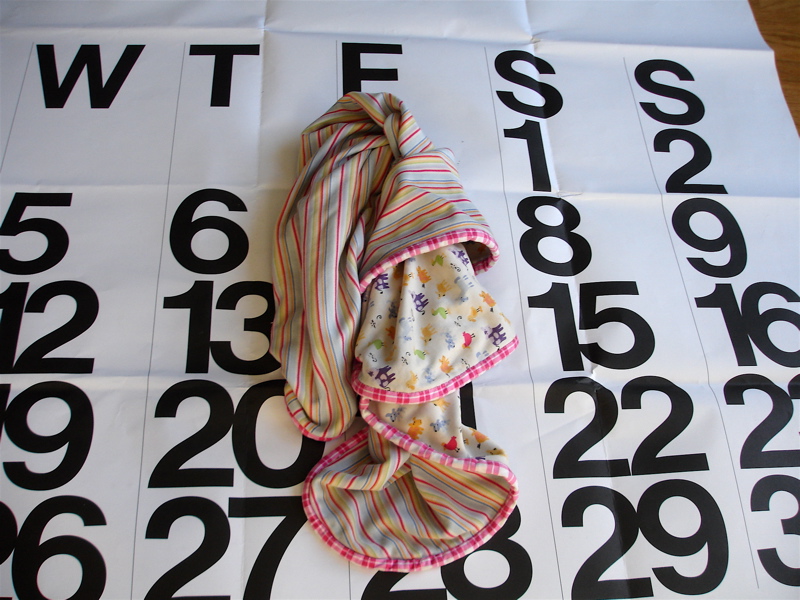 – There is another baby in the house. It’s Bea’s blanket – she treats it like I treat Claire. Dressing it up, feeding it, holding and talking to it. And she seems to tell me about her baby blankie non-stop all day long. Blankie had to have his… or her picture taken on the calendar too.