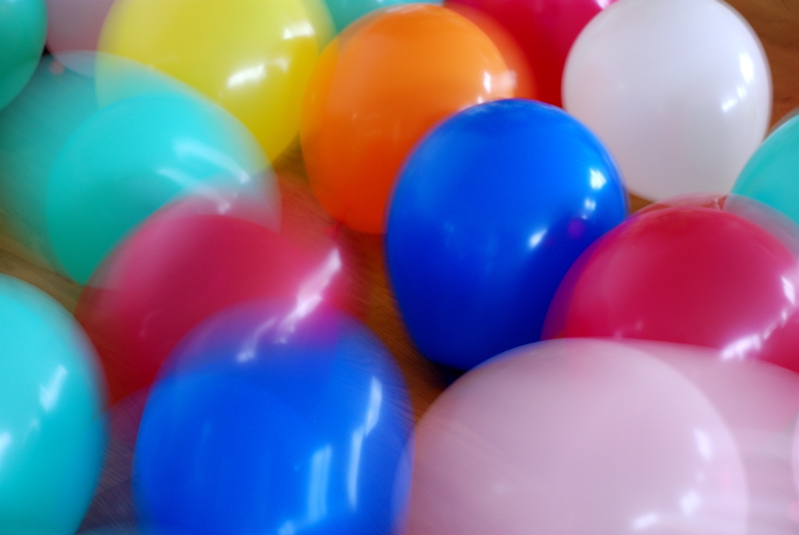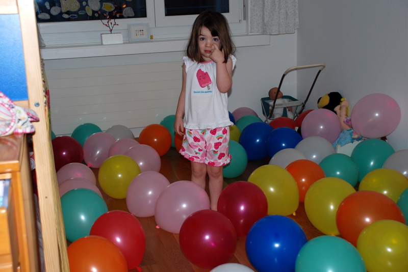 The balloon fairies filled her room with balloons the night before. Here she is right after she woke up to the surprise.