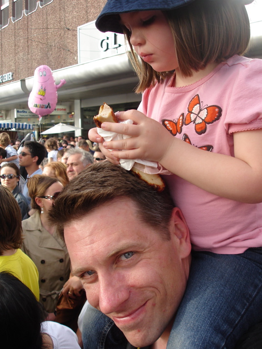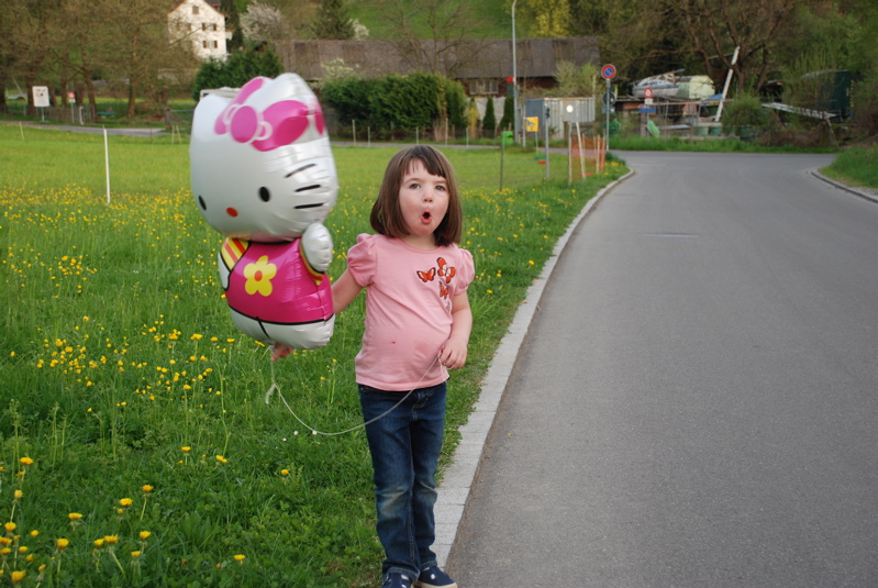 Brian bought her a big balloon because she doesn’t get enough treats – yeah. There’s a little story to go with this photo. Apparently Bea fell down the stairs on the train as they were about to get off at our stop. As she was falling she let go of her balloon. The train is two stories high so Brian couldn’t reach it as they got off the train. Of course she began to cry and of course Brian couldn’t have any of that. So they hopped back on the train, retrieved the balloon and got off at the next town. Then they had a fairly long walk home. Brian carried her on his shoulders some more and he was extremely sore when he got home. I think she might be spoiled and I think he might be wrapped around her little finger. Hmmmmm.