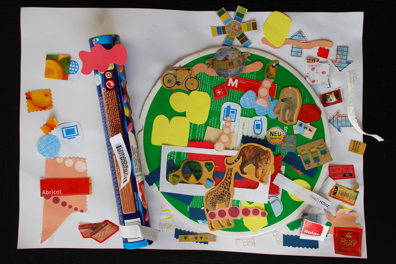 We started making collages. I cut stuff out and she glues. And now whenever we come across a little scrap of paper that she finds interesting we must save it for her collages.