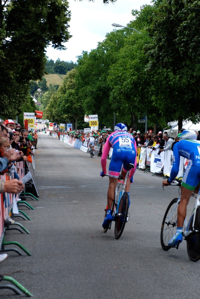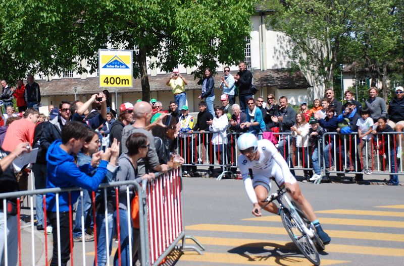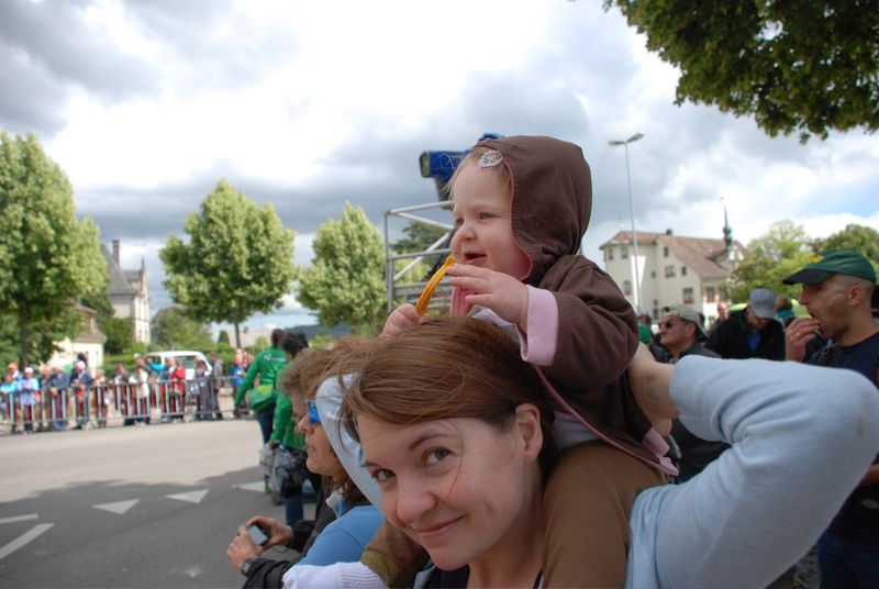 Today we went to the Tour de Suisse. It was the last stage of the race – a time trial through the town of Schaffhausen. There’s something about being there so close to all the people that you see on tv. As we made our way to the finish area we spotting Mark Cavendish on his way to the starting line, some mechanics were walking around with official badges carrying some really expensive looking wheels. And we saw lots of riders warming up outside their fancy team buses. There’s a great buzz of anticipation in the air. So fun! We settled into a good spot about 400 meters before the finish line. Bea looked forward to getting free stuff like hats and cow bells from the vendors. And of course we took lots of pictures.