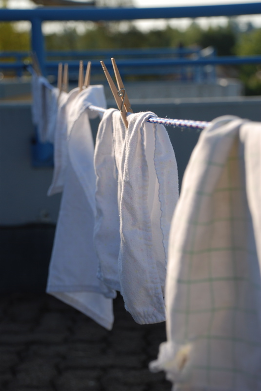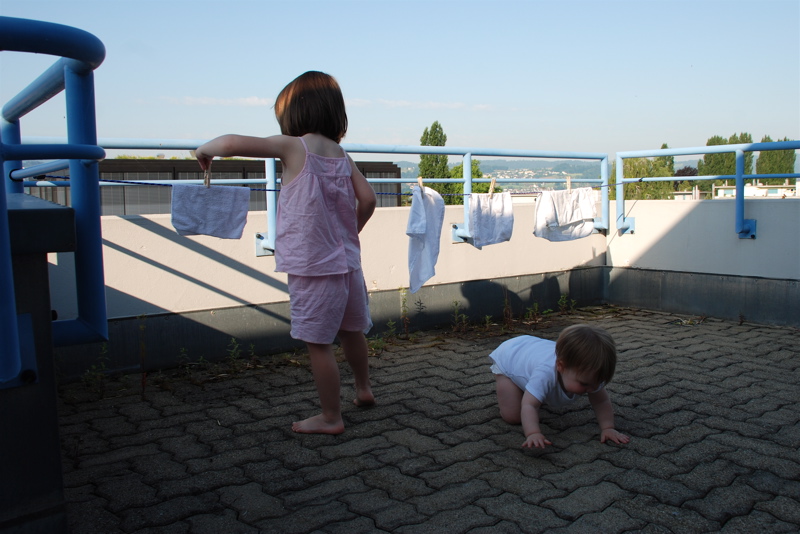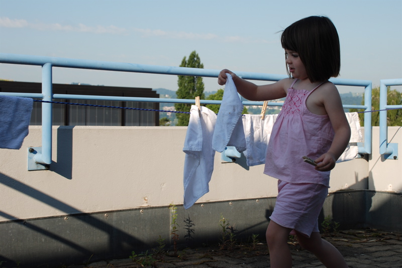 Lately I’ve been hanging a few clothes out on a clothes line – mostly because I feel like our dryer is hard on our clothes and it’s quicker to hang them out. Bea was fascinated and hung a bunch of wash cloths and dish towels out the other morning. The cool air in the mornings has felt so nice this week. Maybe I hang clothes out there just as an excuse to be outside.