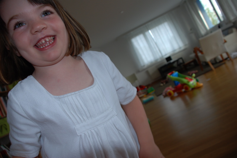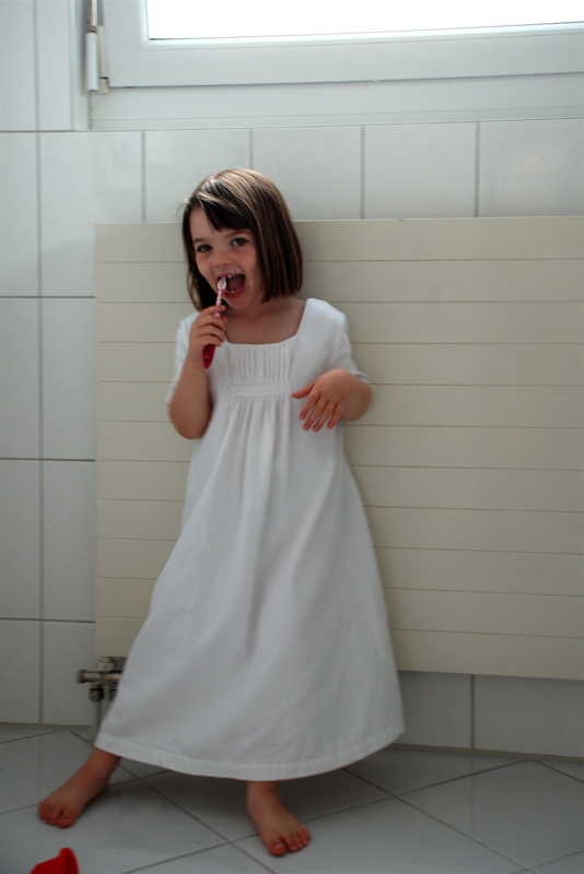 I’ve wanted to make a long pretty night gown for Bea for a while. This is what I came up with using an old flannel sheet and a new online pattern. It has one pink button on the back.