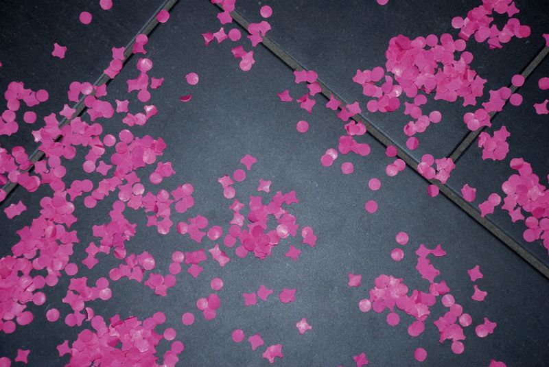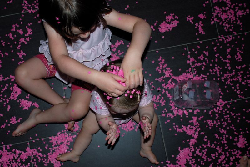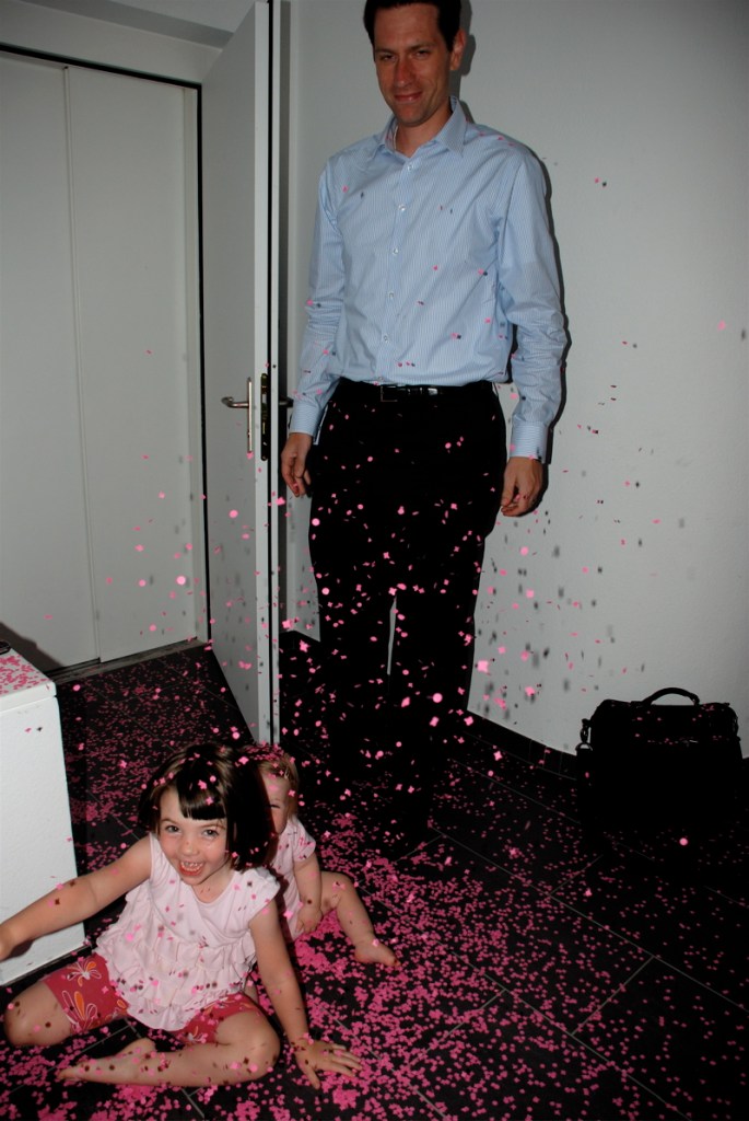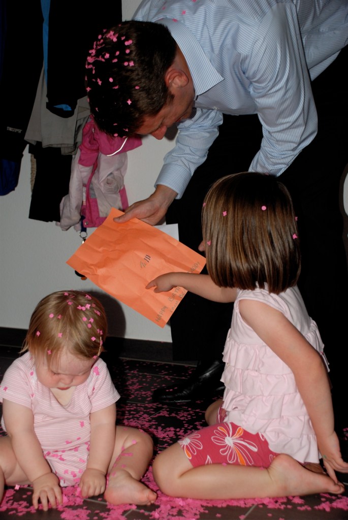 Last year we surprised Daddy with a bunch of balloons. This year we surprised him by throwing confetti at him when he stepped off the elevator. Bea gets a really big kick out of this. And I’m not afraid of a mess. I don’t mind sweeping up pink confetti – kind of like sweeping up fairy dust compared to the usual mix of crumbs and dirt that I find on the floor.