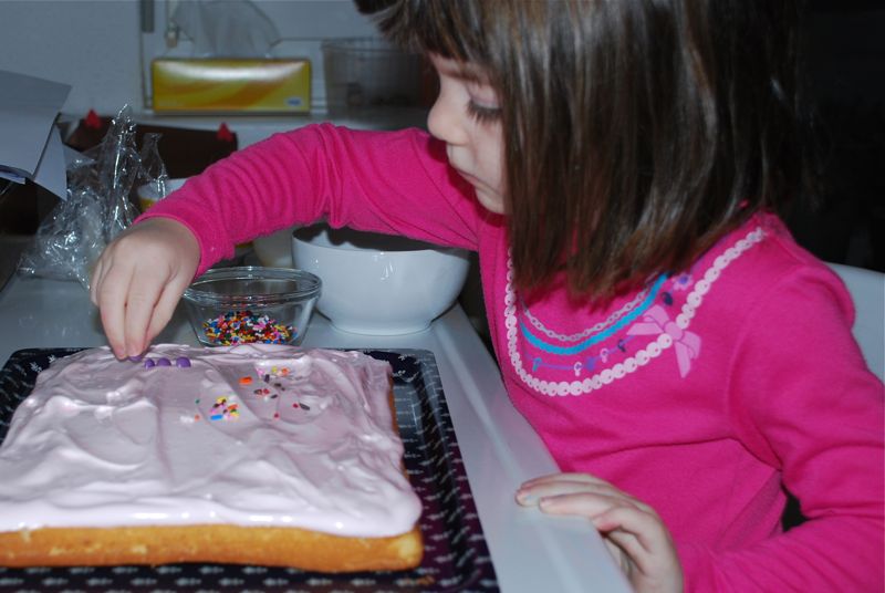 I’m feeling wistful. These milestones and the million little moments that come with them are so precious. Making the cake, peeking excitedly into the bowl of frosting while I mix it, seeing her concentrate while she sprinkles candy, her proud face. My darling almost five year old.