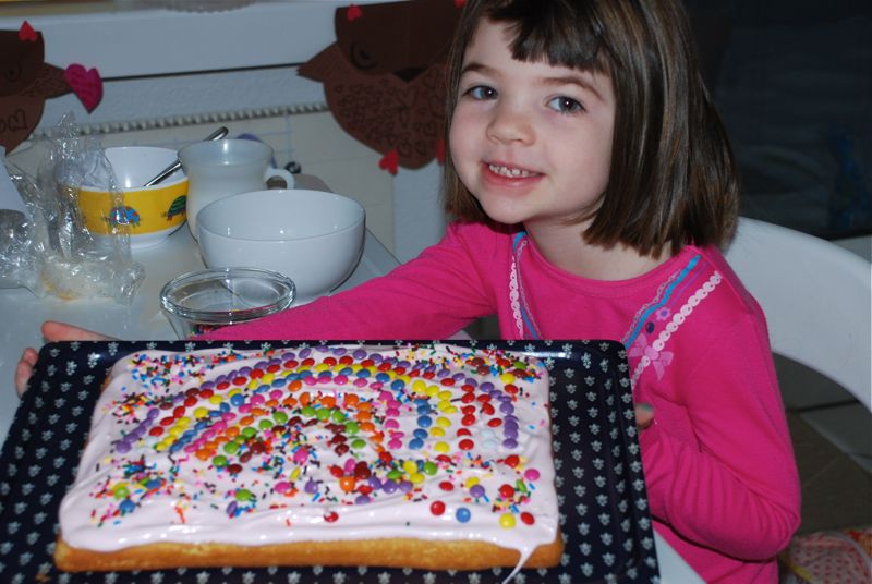 I just dropped Bea at school with her Birthday cake. Today is her day to celebrate with her class and her teacher. She woke up early to decorate the cake with a rainbow.