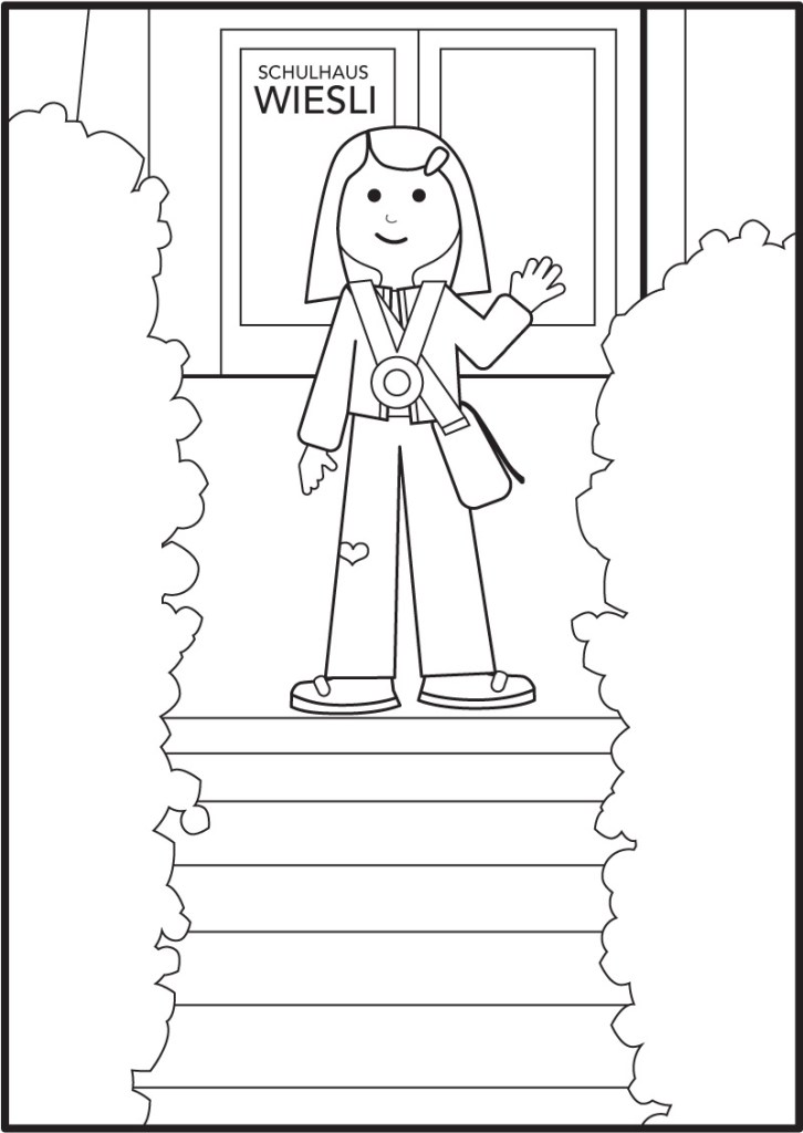 To commemorate the year I made a coloring page with Bea standing in front of her school. Also, it was a good excuse to try out my updated drawing software.
