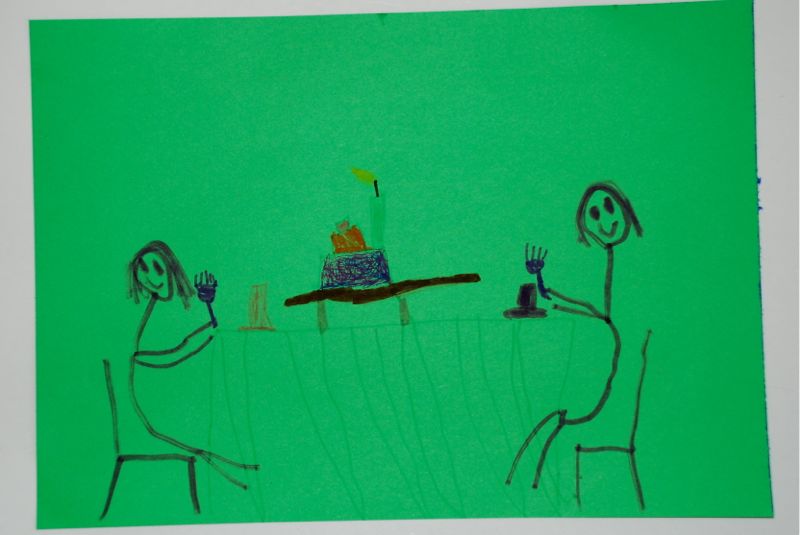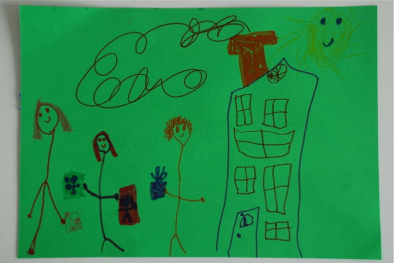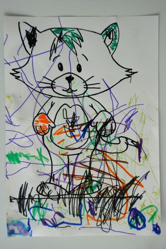 Here are a few pictures that Bea and Claire made this week. Claire is cute when she draws lately – she gives a running commentary about the kitties that she is drawing and she tends to make these loop shapes a lot. Bea’s drawings are more complex all the time – she often draws our family having a birthday party.