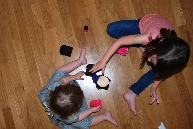 We made this cute game – the PB&J game – out of some felt. You have to roll the die to build your sandwich with the bread , jelly and peanut butter pieces.