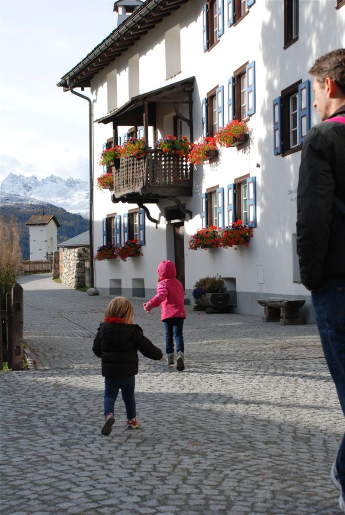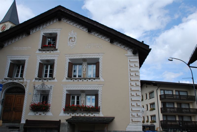 We stayed in a small town called Silvaplana – it’s especially beautiful because there are beautiful lakes and mountains everywhere you look. This is the area of Switzerland where a small group of people speak Romansch. The houses have very thick walls and they are decorate with pretty patterns.