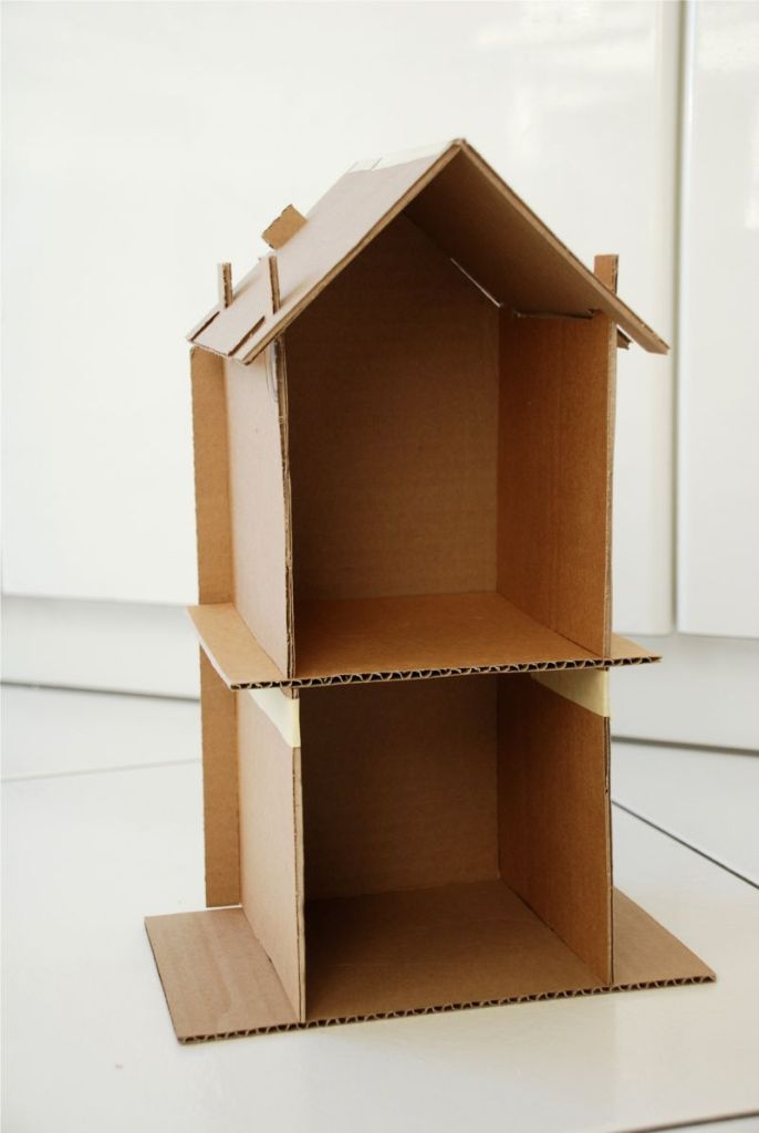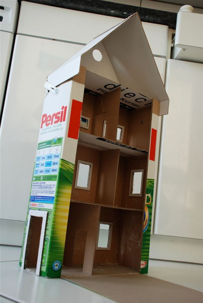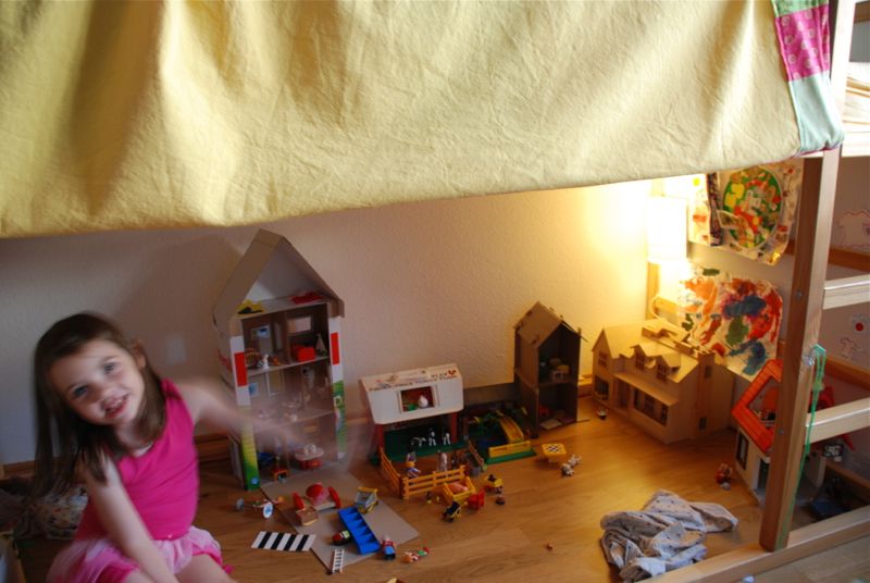 I don’t know if you’ve noticed, but I must be making something or I’m not happy. For some reason I got a bee in my bonnet about cardboard dollhouses this week. I made two for the girls. And then, since we haven’t been using the space much, we transformed the area under Bea’s bed into Playmobil and dollhouse land.