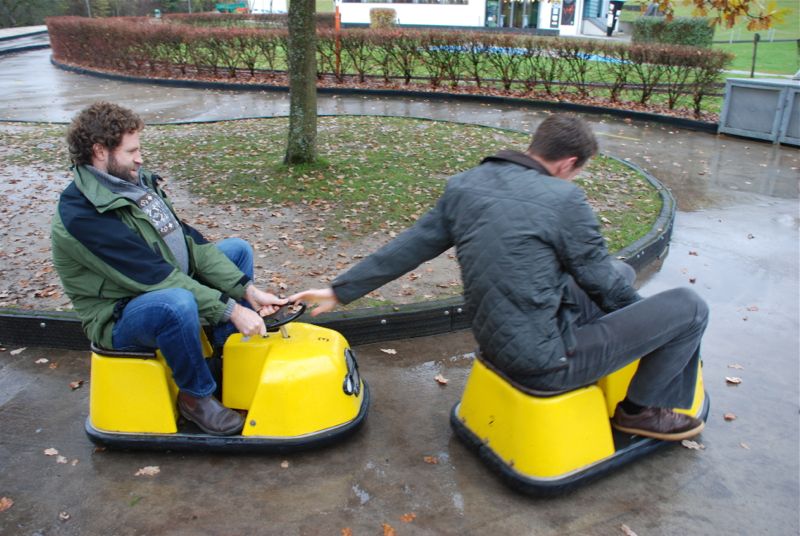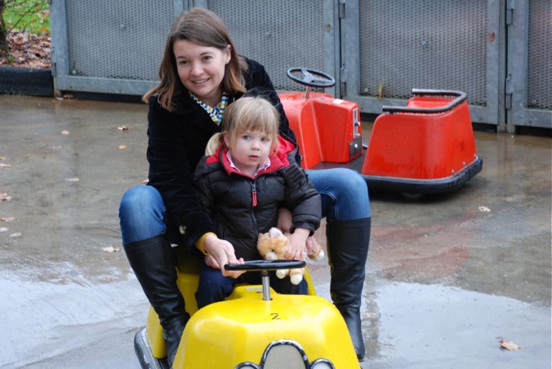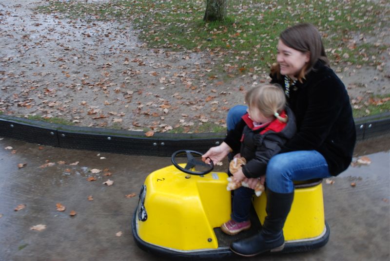What is that bulge in Tom’s shirt? Oh it’s his darling new baby Mateo. Snuggly and warm on a cold rainy day – going for his first bumper car ride.