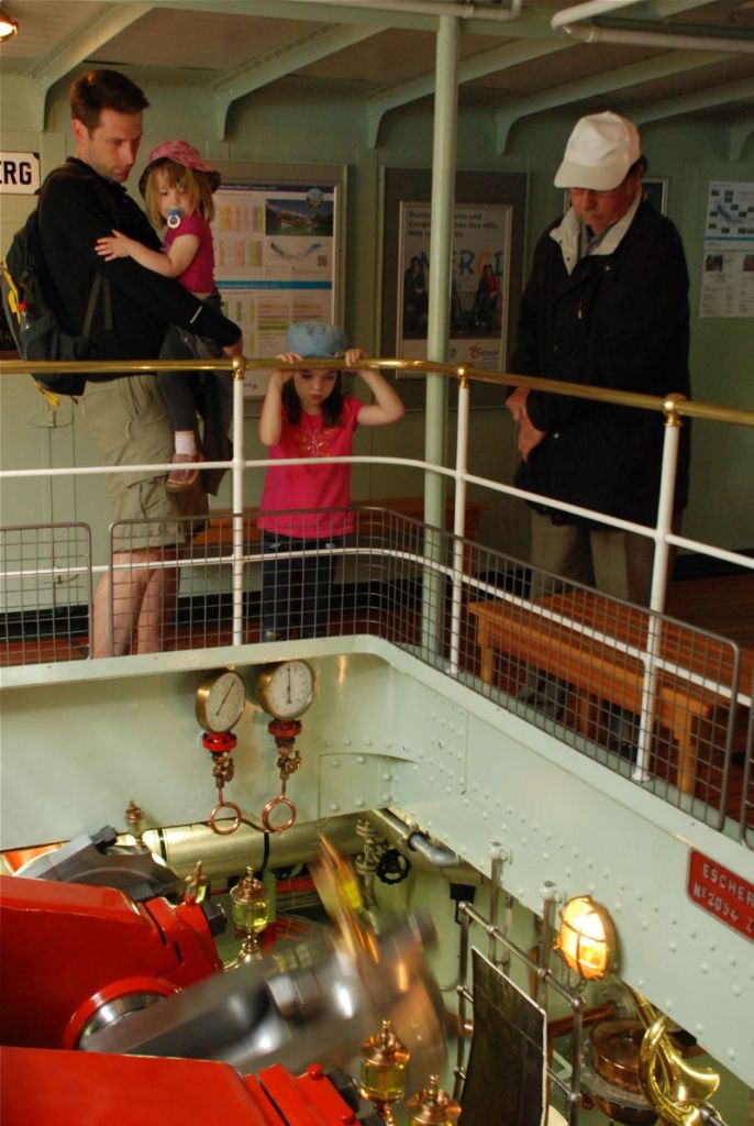 And here are Brian and the girls watching the whirring mechanism that turned the boat paddles. Cool.