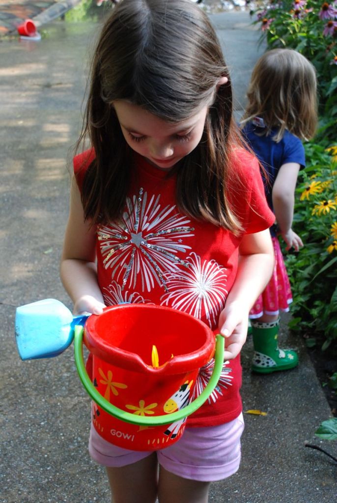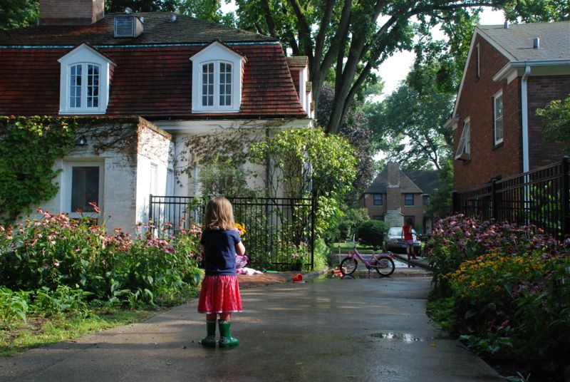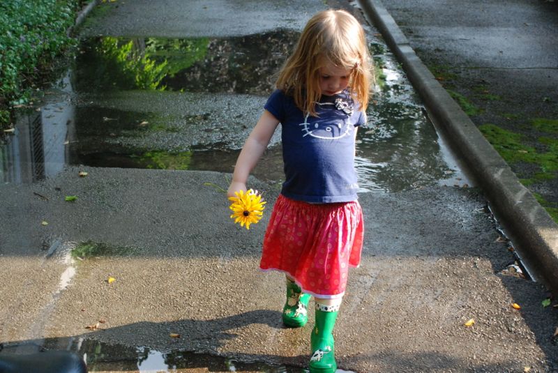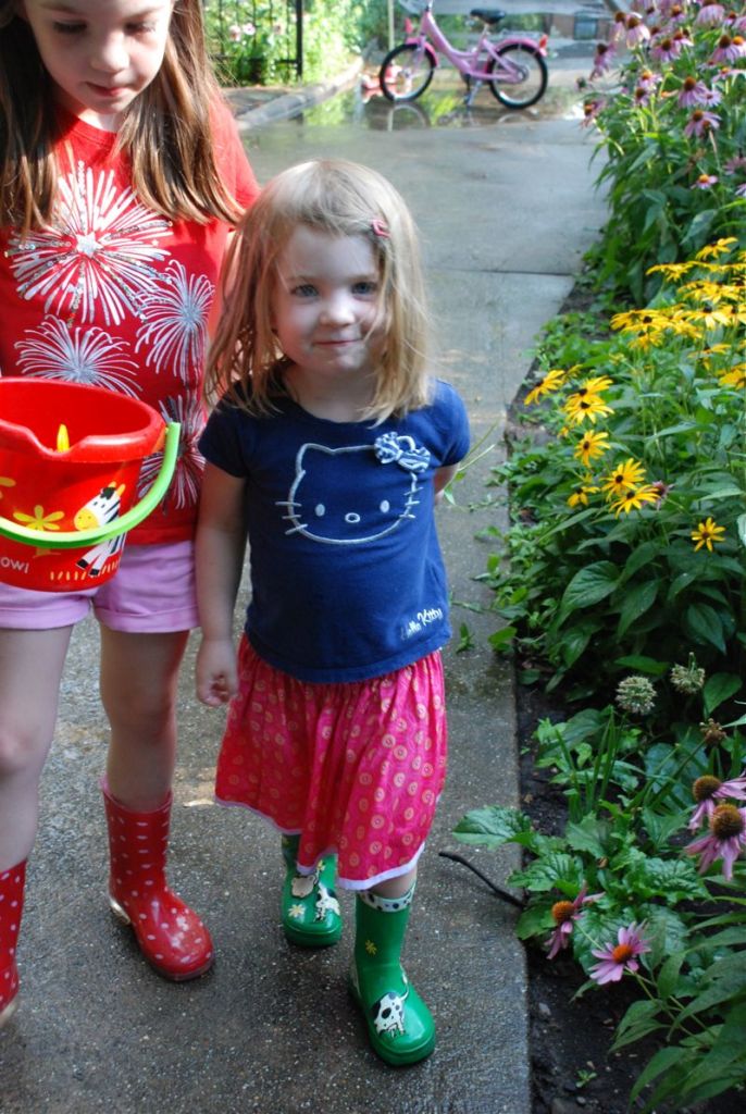 Our old driveway has great big puddles when it rains… or when I let the girls run the hose for a while. And I uncovered their rain boots so they were happy.