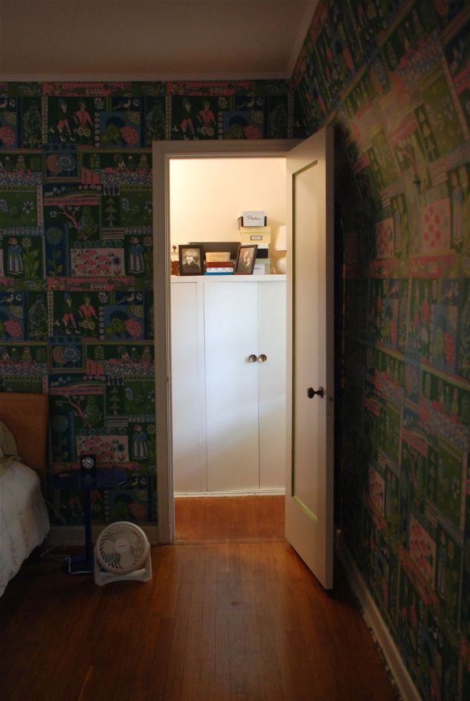 I have big plans for this little space. I’d like to put all my most precious photos and artwork in there – on the walls and on top of the cabinets. I’d also like to frame a section of the wallpaper that is in our bedroom. There are extra rolls of the wallpaper in the basement and I like the idea of preserving some of the old part of our house because it makes me smile.