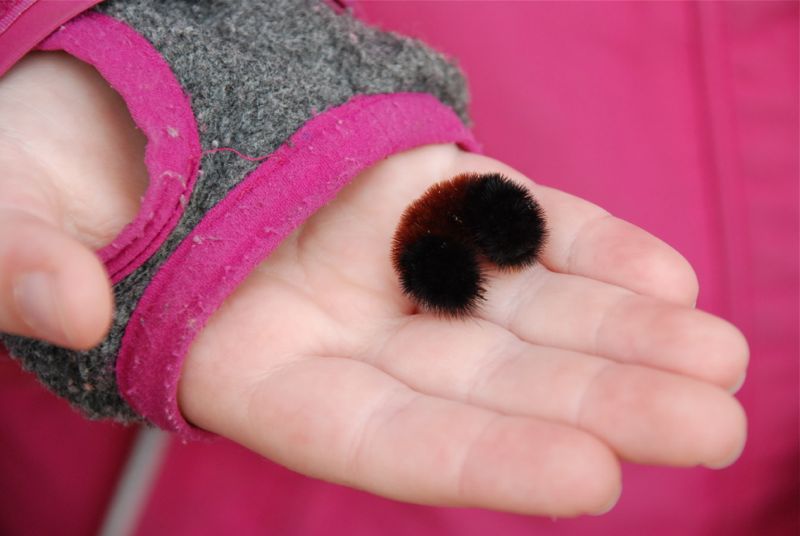 We found a wooley bear – two in fact. When we came upon the first one everyone was going over to it, gathering around and getting a closer look. Claire walked right over and stomped on it. She has this violent streak when it come to nature. After that my sensitive Bea was really shaken up and sad that the wooley bear was (possibly) dead. We found another one and I had to make Claire keep her distance.