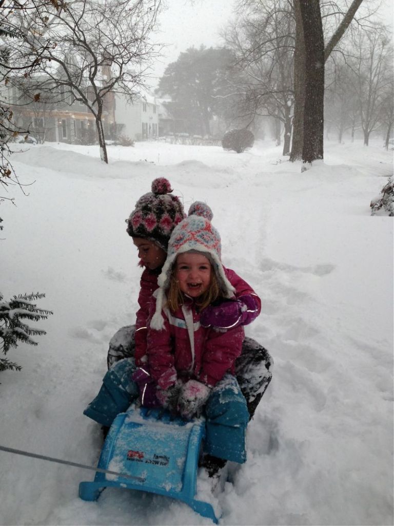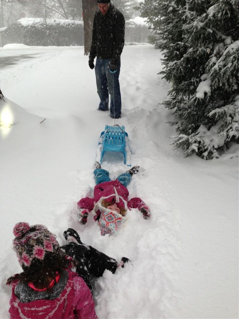 We walked to the grocery store and pulled the girls on the sled. So much giggling – especially when we would go over a big pile of snow and the girls would fall off the sled.