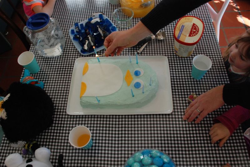 Another penguin cake and you can just see the blue jello decorated with plastic penguins on a plate beside the cake.