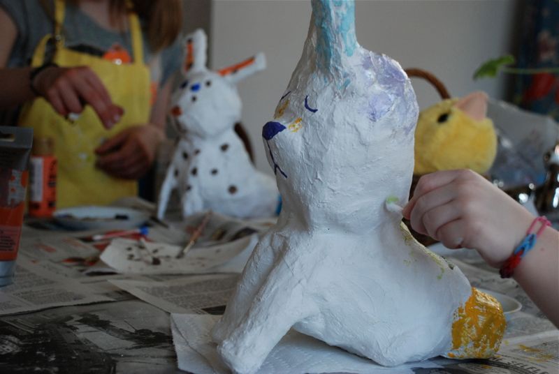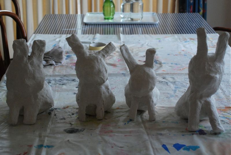 First we made our balled up newspaper forms and then we covered them with plaster gauze. Messy but pretty easy. Claire and I learned the process in the art class that we take together. We made a snowman a couple months ago. A craft that’s easy enough for a mom and a 3 year old to do.