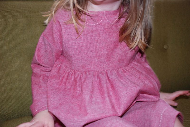 I made a dress for Claire – the Playtime Tunic pattern from Oliver + S. I added some hand stitching around the colar and the hem. My silly girl is so used to wearing sleeveless dresses (all winter) she said “is it a nightie?”