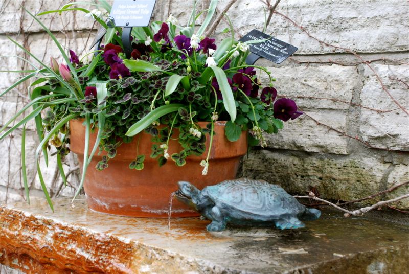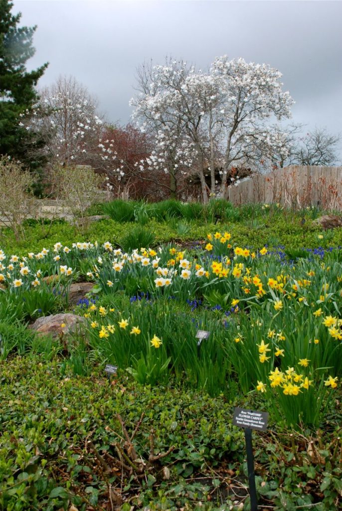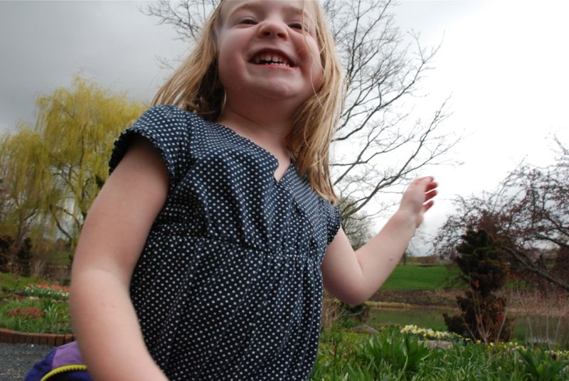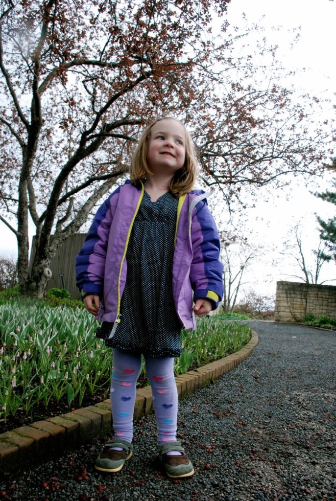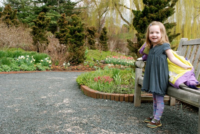 Claire and I took a walk at the Chicago Botanic Garden on the last day of April. It was a rainy walk with lots of flowers. I so enjoy seeing the vegetable gardens – their peas and lettuce were way ahead of our little sprouts – but I guess they probably brought them out of their greenhouses and planted them recently. The beds all looked so good with their dark wet soil and the little plants lined up neatly. It all felt very hopeful.