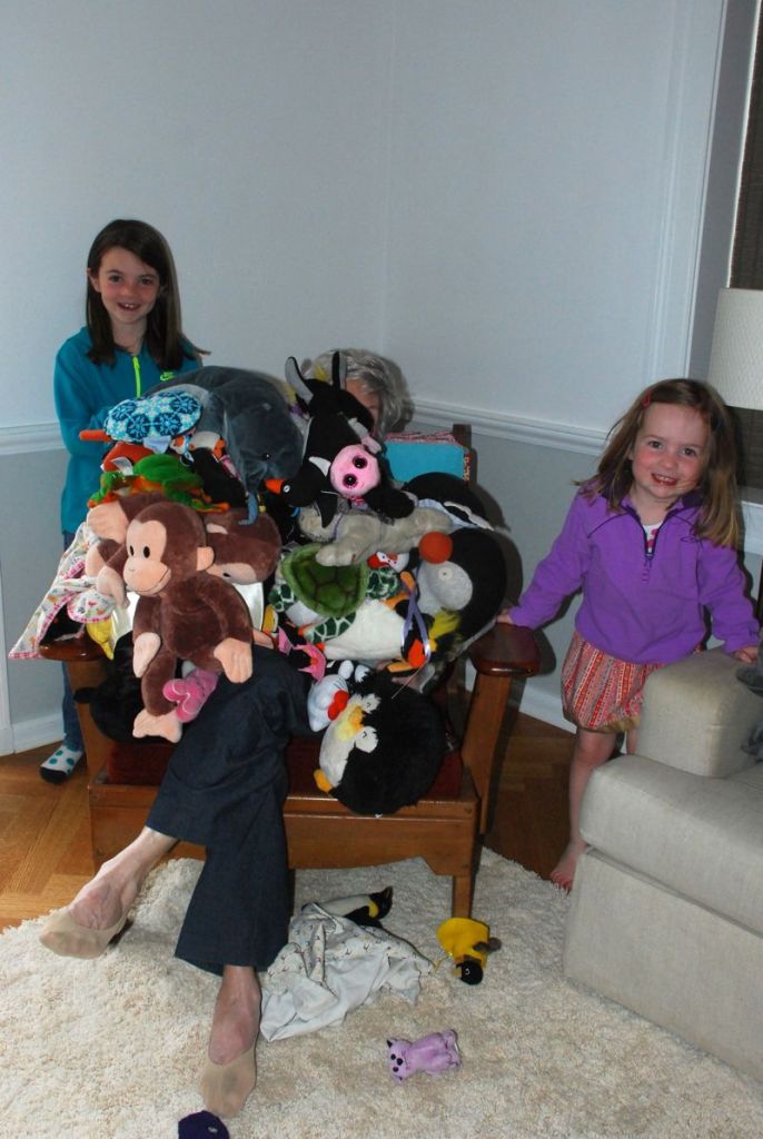 Here’s how the girls greeted great grandma – she’s under the thousand stuffed animals.