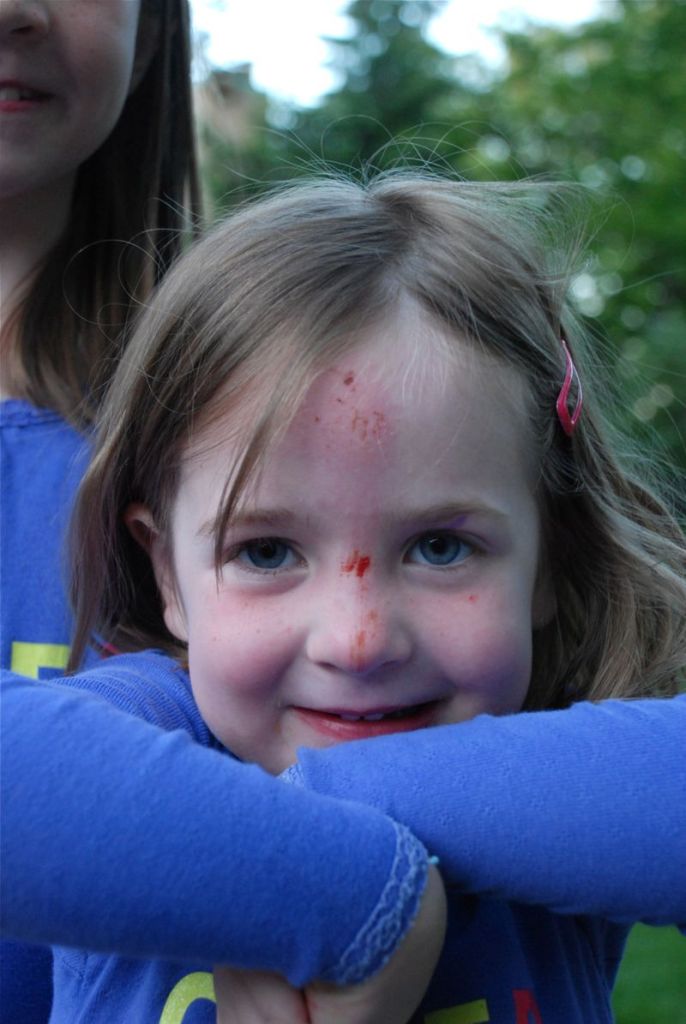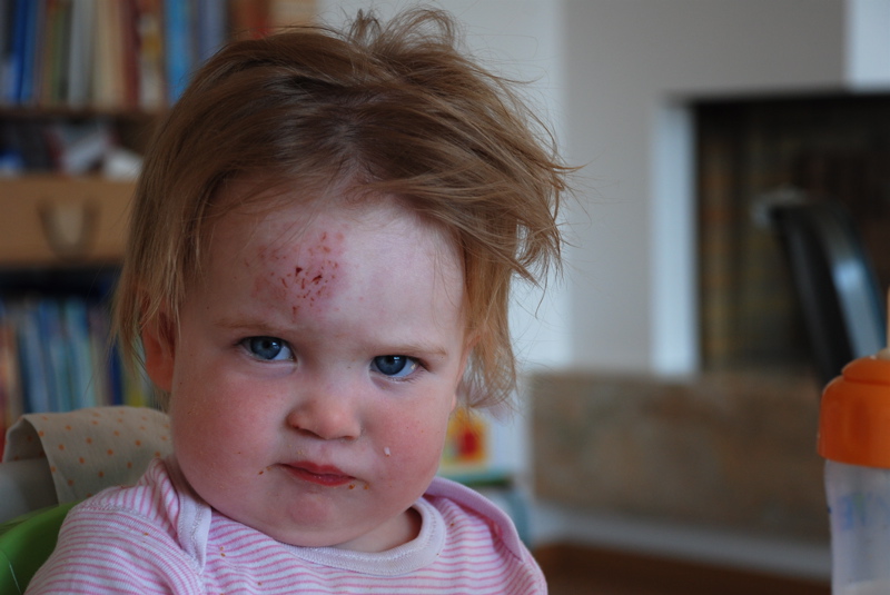 Claire got a nasty bruise and scrape on her face yesterday… again. This is the fourth time she’s fallen (or been dumped) on her head. This time she had a bloody nose too. She’s tough and she didn’t cry much, but it still freaked me out. All she did was trip and fall on our driveway – she wasn’t even running. I looked over and her face was on the pavement and her body was twisted in a way that was not natural.