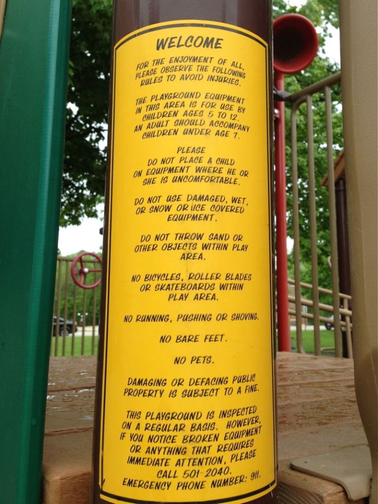 And another bad sign from a playground. It really actually says no running! NO RUNNING AT A PLAYGROUND – what is the world coming to? Also, barefeet are not allowed. Uhg.