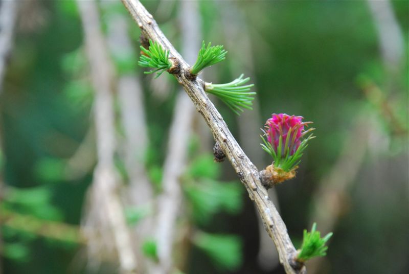 This is a Larch tree blossom. The hotel china had a delicate pattern of larch tree branches and blossoms. The woods and the meadows were so pretty with early spring flowers blooming everywhere we looked.