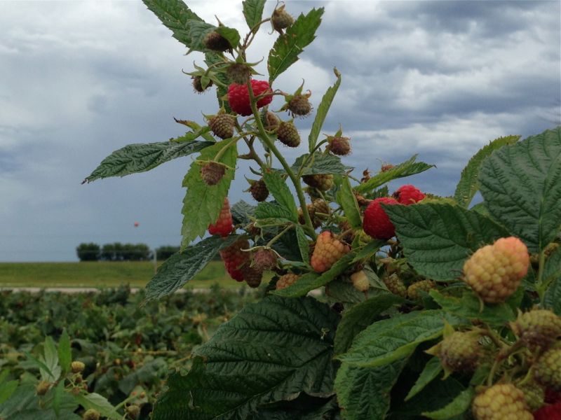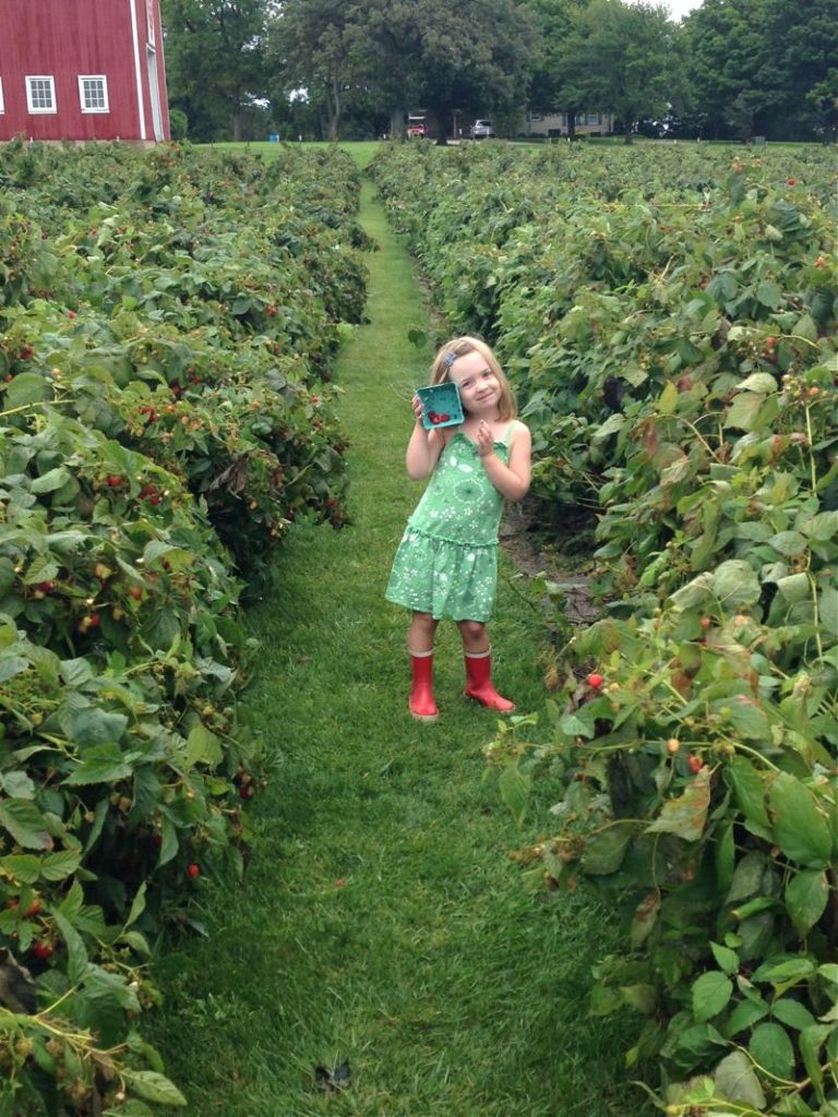 Claire and I have a free day on Thursdays. No pre-school, no classes, no nothin’. So today, being Thursday, we decided to drive up to Wisconsin to pick raspberries. I’ve never picked raspberries before. Well that’s not true. In high school Brian and I used to wander along the old train track in Midland. That was before it was turned into the rail trail. It ran in front of his parents old house and it was lined with wild raspberries. I remember walking down there at dusk and picking raspberries and talking, talking, talking. Anyway – Claire and I got to do some picking and it was fantastic. I revel in those perfect ephemeral fragile fruits. A delicious morning.